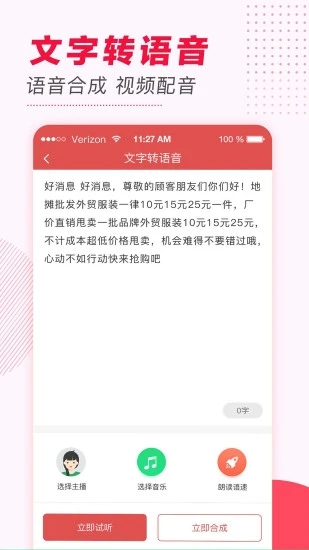文字转语音app最新版这是一款非常智能非常实用的手机软件,当你想要把一段文字转换成语音时就可以使用该软件了。文字转语音app最新版在我们的生活和工作中运用的非常广泛,例如在商场商店里需要播放打折促销语音广告,这个时候就不用请专业的播音员来录制广告了。可以直接把广告词写下来然后利用这款APP转换成语音模式,这样就制作好了语音广告。