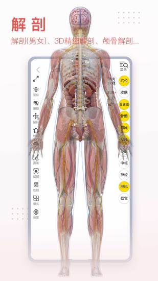 【显示、隐藏】“任何”一块可以显示或隐藏,只显示想要看到的结构,无限地自由拼接组合,一切由你来控制。让手指成为解剖刀,实现逐层剥离,完全再现人体解剖的全过程。