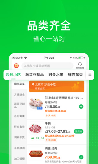 美菜商城下载2021最新版相信大家都有了解过,美菜商城下载2021最新版是专门用来线上买菜的,平时大家休息时间并不多,可能会因为工作原因过于疲劳并不想要到线下商超中购买商品,想要足不出户就能买菜的话都是可以来尝试使用这款软件的。这里无论是什么种类的食材都有提供,一键搜索就都能立即找到,每一样食材也非常的新鲜,基本上都是当前才上架出售的,不用担心到货之后会发现有食品安全问题。每次登录进来后都可以找寻距离自家最近的门店进行购买,因为都是有提供上门送货服务,选择近一点的话也是能缩短很多送货时间呢。在价格方面也是非常实惠的,而且登录进来后还可以领取优惠券,下单支付立马就能省钱哟。
