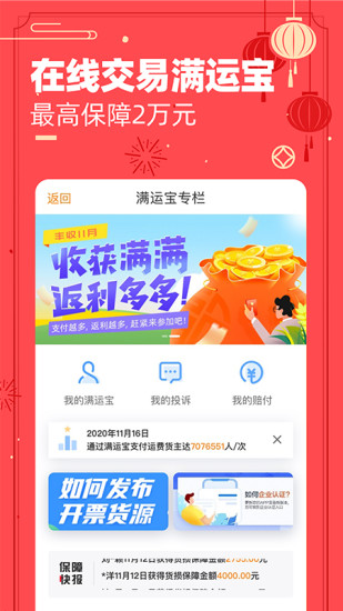 运满满破解手机版是国内超过百万货主都在用的一款拉货轿车手机应用软件。它能够为或者们提供一键寻找车源、一键匹配司机、快速解决货主门送货配货的问题,是一款非常智能的02O手机物流平台。平台拥有海量的专业注册司机资源,用户在这里发布拉货信息后可以在短短一秒钟内快速找车,并找到相应的拉货司机信息。软甲你拥有非常准确的定位功能,可以准确的为用户设置拉货路线,并且可以让货主们实时掌握运输的全程。有了运满满,让您货运更有保障。喜欢的用户快来一起下载使用吧。