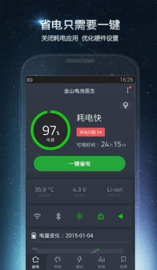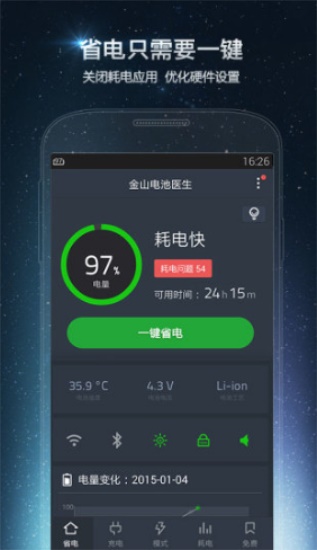 金山电池医生2021最新版是北京金山软件最新推出的一款非常好用的电池保养应用软件。很多用户常常外出一天就面临手机没电的烦恼,现在有了这款软件。它为用户提供了超强的省电模式,用户可以通过自定义添加的方法,将省电模式添加到手机上。手机切换成省电模式,将可以全方位的为手机省电,让你的爱机能够更加持久的使用,平均延长了将近一倍的待机使用时间。不仅如此,它还可以实时的提醒用户当前手机电量的可用时间。有需要的朋友们赶紧一起来是我IT网下载使用吧。
