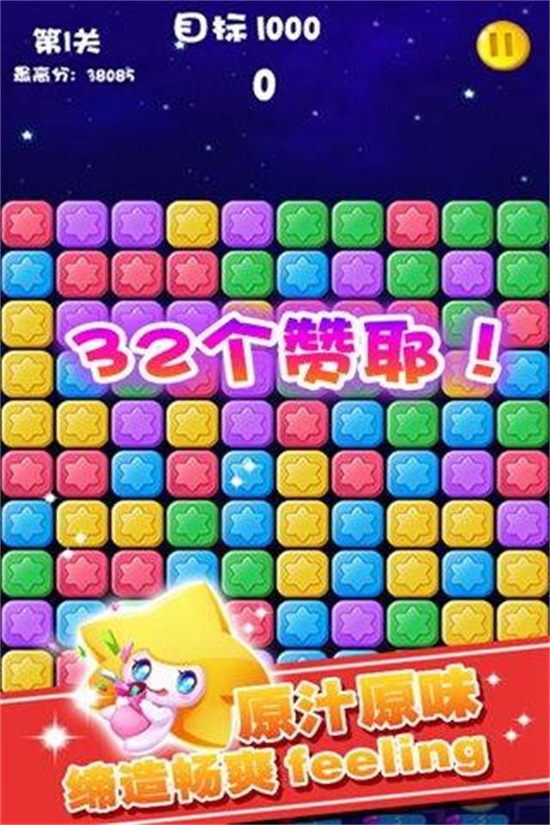 消灭星星官方正版是一款非常轻松解压的休闲益智手机游戏。游戏的玩法和规则非常的简单,玩家要让颜色相同的星星连在一起进行消除,并且越多越好。如果玩家最后剩余的星星小于10个,将会得到系统额外的加分。最后剩余的星星越少,加的分越多。游戏一共有十多个关卡,每一个关卡都有相应的目标得分。游戏推出了真人闯关和真人对战两种模式。整个游戏的操作和玩法都很简单,玩家只需要通过手指触摸屏幕的方式操作即可,容易上手。这样一款经典的手游你还不快来一起下载体验一下。
