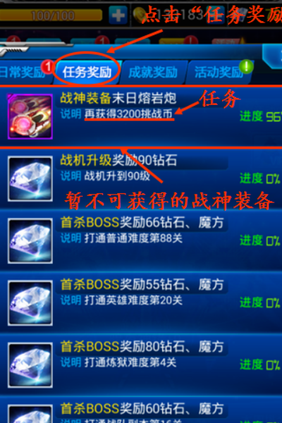2、点击“任务奖励”,将会弹出可获得的战神装备和暂不可获得的战神装备,暂不可获得的战神装备可以通过完成任务获得