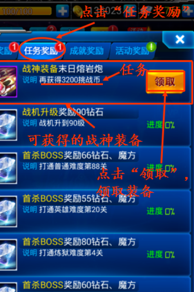 3、完成任务后,再次进入“任务奖励”,点击“领取”,即可获取到战神装备。
