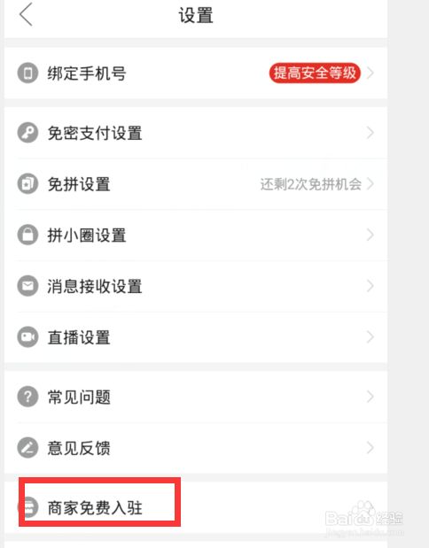 第四:返回个人中心点击【设置】选择【商家免费入驻】选项。