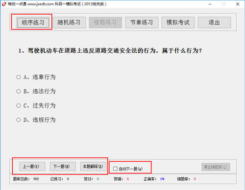 1、单击【顺序练习】,可以按照题库顺序开始答题,根据答题情况选择【上一题】或者【下一题】,如果不清楚答案,可以选择查看【本题解释】,想要快速切题,可以勾选【自动下一题】。
