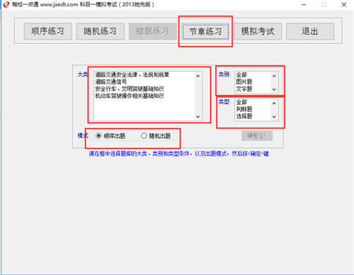 3、单击【节章练习】,在【大类】中选择对应分类,在【类别】中选择对应选项,选择对应【类型】,在【模式】中选择你需要的模式后,单击【确定】开始练习