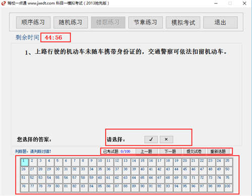 4、单击【摸你考试】,根据正式考试规则,规定考试时间,超时自动交卷,总共设置100道题目,【上一题】,【下一题】,【提交试卷】后不可重新答题