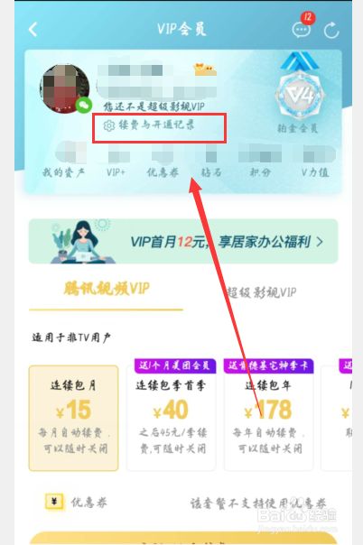 进入用户设置界面,一般购买视频VIP之后会自动出现在用户的头像下面,点击【续费与开通记录】。