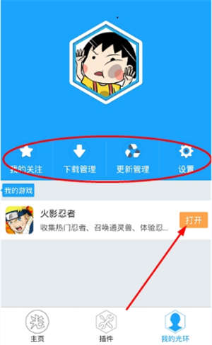 3、在“我的光环”专区,您可以通过游戏插件直接打开游戏,快速进入游戏界面,而且还能查看“我的关注、下载/更新管理、设置”等参数哦。