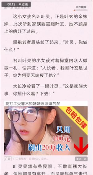 这时页面右上角会显示正在赚钱,在阅读页面可以看到穿插了广告,点击广告下方的关闭选项再选择确定关闭即可关闭赚钱模式。