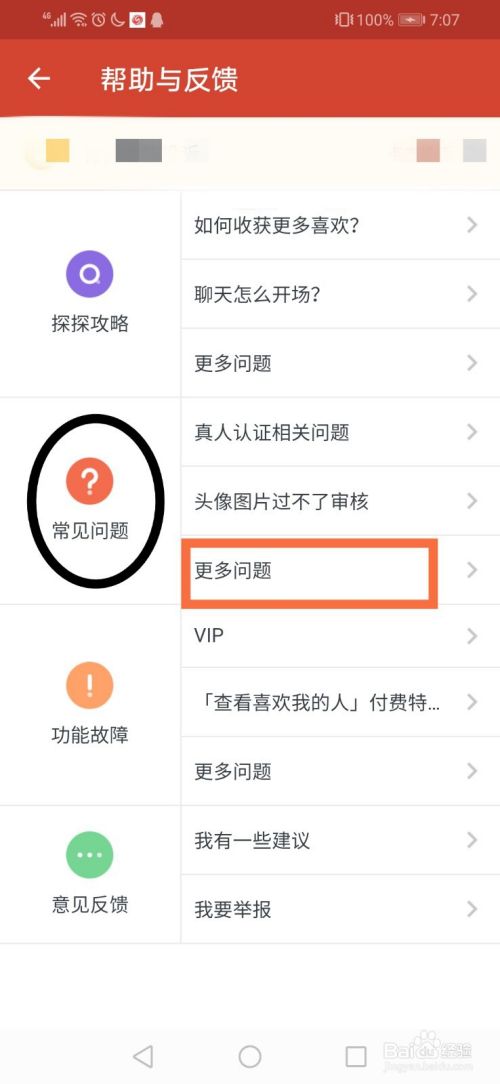 在“帮助与反馈”界面选择“常见问题”中的“更多问题”,点击图中红色方框处。