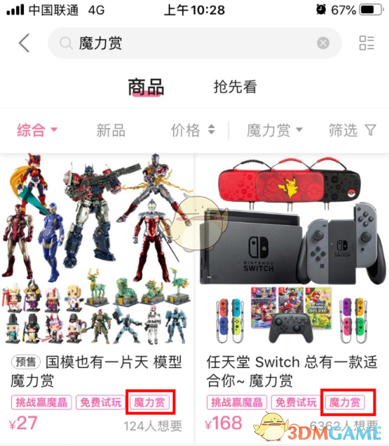 2、然后在搜索栏输入“魔力赏”,就可以看到支持用魔晶来购物的商品了。
