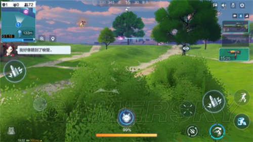很多地方都跟吃鸡相同,就不多累赘。这里说个跟吃鸡不一样的机制,就是机甲机制。开局后,每个角色都会有个充能(屏幕正中偏下),当充能百分百后,玩家就可以召唤机甲,切换成机甲模式。这里我现在草丛里ob,看前面神仙打架。当充能满了之后,我就召唤机甲上去厮杀。