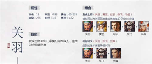 配件:1、刘备,刘禅 三义的缘分分别能较大提升关羽张飞的能力,刘备的近战无敌也是十分imba。在五虎未成型之时,3级以上刘备和刘禅辅助5-6级的关羽能吊打其它未成型队
