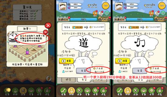 做完以上动作,就要找萝卜了,战争、早晚餐、世界中的周末神兽挑战都可以获得不同时间段的金币收益,同时也会增加繁荣度推高翻倍率,萝卜不能连续吃,要吃一个变革一次,或者神兽挑战一次变革一次,不要连续吃或者连续挑战,原理就是比如吃一个萝卜翻倍300倍,连续吃两个就是加法600倍,吃一个变革一次就是乘法300*300=90000倍。