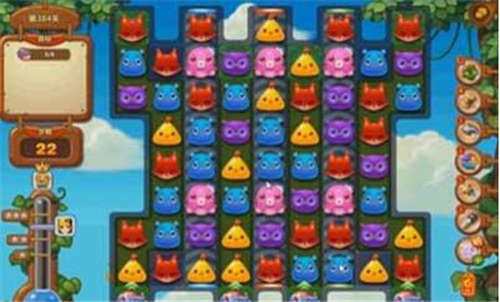 看到没?先做一个竖直,界面的蓝色小动物能帮助你打通这一栏的所有道路,直接就能收集一个目标,运气非常的不错,如果玩家也有相似的情况记得不要等待五连的机会了,可以直接先用。