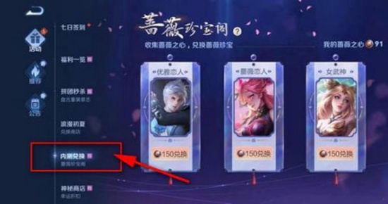 然后下滑到下方的内测兑换选项,就能进入王者荣耀蔷薇珍宝阁了。