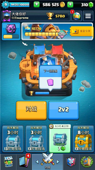 4、只有4个宝箱位置,每赢一局随机得到一个宝箱。开箱的话,银宝箱要3小时,金箱子要8小时,紫箱子要12小时。如果宝箱满了,则不会在获得宝箱。