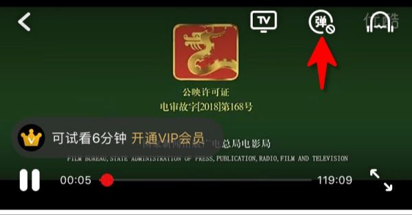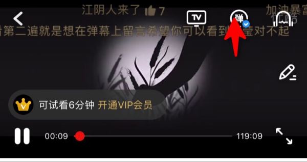 3.想要关闭弹幕的话,和开启键是一样的,点击红色箭头处,蓝色对勾就变成白色圆圈禁止标志了,这种状态就是关闭了。