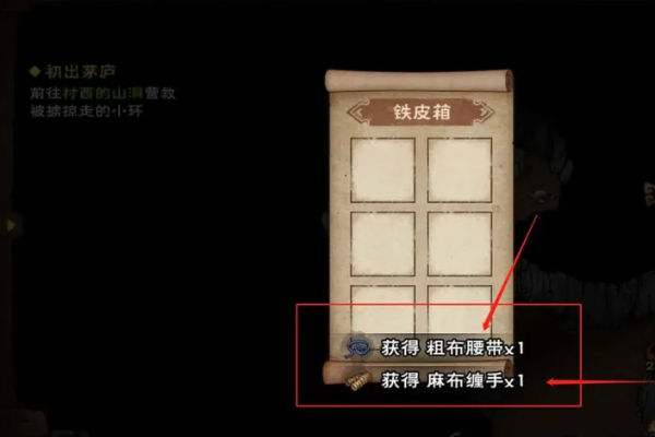 4、发现箱子里面有两个物品点击就会获取,一个粗布腰带,一个麻布缠手。